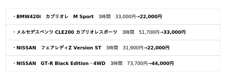 3時間・6時間の特別料金プランを提供。各種車種の割引はもちろん、記念日やサプライズ演出、オリジナルドライブコースなどのご相談もレンタカーコンシェルジュが対応。映える一台で、忘れられない特別な時間を演出します。