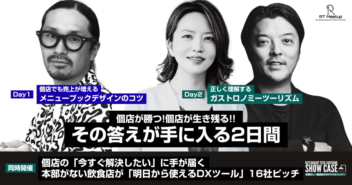 今回は「本部なし!個店向けのデジタルハック!」をテーマに、人手不足やコスト高騰、煩雑な管理業務といった小規模飲食店の課題を解決するサービスを運営する企業が登壇し、サービス紹介、導入事例、デモ実演などを2日間にわたって開催します。