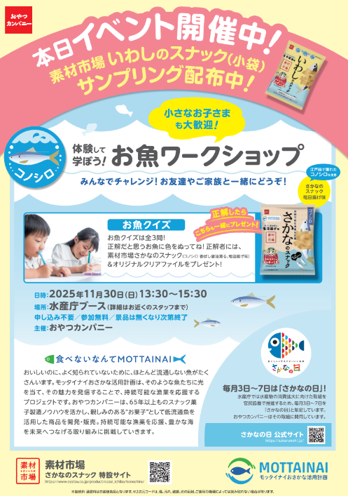株式会社おやつカンパニー(本社所在地:三重県津市 代表取締役社長:横山正志)は、2025年11月30日(日)、東京都立日比谷公園にれのき広場で開催される、日本を元気にする魚の祭典「Fish-1グランプリ」に出展します。
