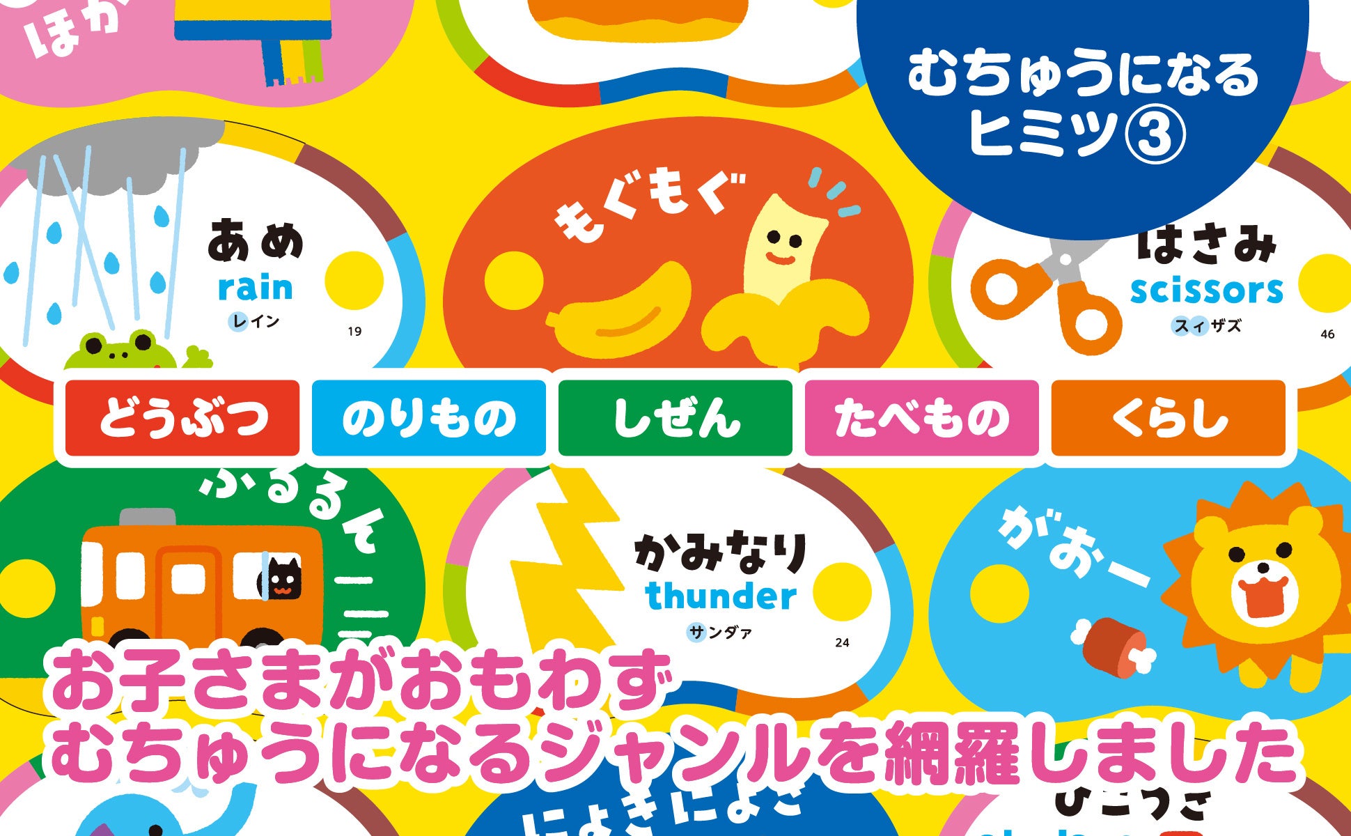 ことばのジャンルは、どうぶつ、のりもの、しぜん、たべもの、くらし、など幅広く集めました。