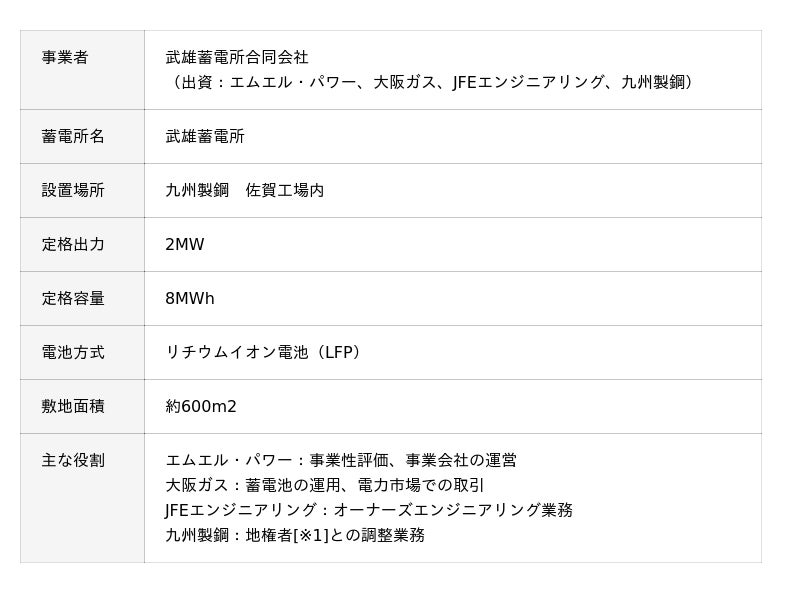 みずほリース株式会社(本社:東京都港区、代表取締役社長:中村 昭、以下「みずほリース」)の100%子会社であるエムエル・パワー株式会社(本社:東京都港区、代表取締役社長:櫻井 成昭、以下「エムエル・パワー」)、大阪ガス株式会社(代表取締役社長:藤原 正隆、以下「大阪ガス」)、JFEエンジニアリング株式会社(代表取締役社長:福田 一美、以下「JFEエンジニアリング」)、九州製鋼株式会社(代表取締役社長:清本 邦夫、以下「九州製鋼」)が共同で出資する武雄蓄電所合同会社は、本日、佐賀県武雄市に位置する系統用蓄電所(定格出力2MW、定格容量8MWh、以下「武雄蓄電所」)の商業運転を開始しました。
