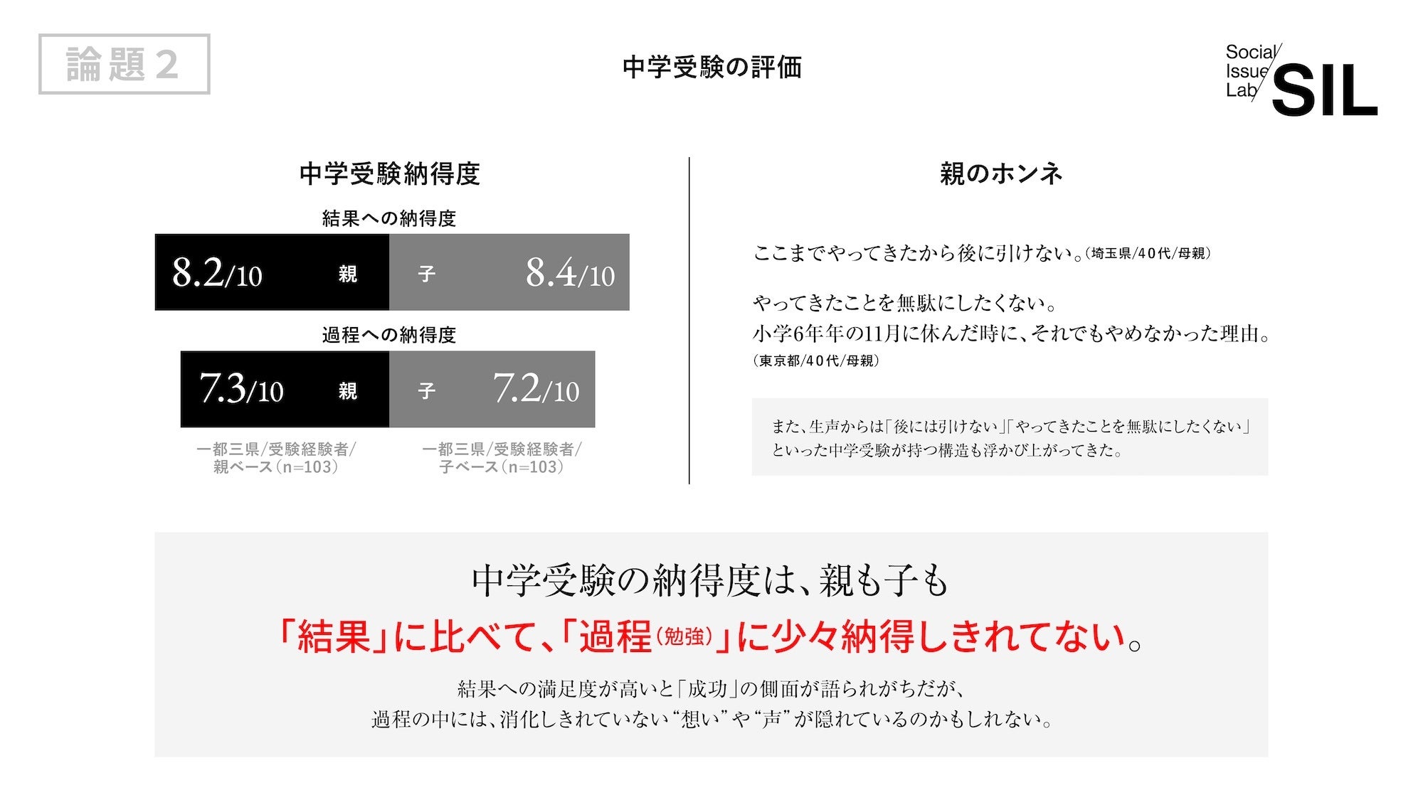 中学受験の納得度について10を最大値として尋ねたところ 、親は過程が7.3、結果が8.2、子は過程が7.2、結果が8.4と、親子いずれも「結果」に比べて「過程(勉強)」への納得度が低いことがわかりました。生声からは「後には引けない」「やってきたことを無駄にしたくない」といった声が寄せられ、受験の構造が親子双方に心理的プレッシャーを与えている様子もうかがえます。