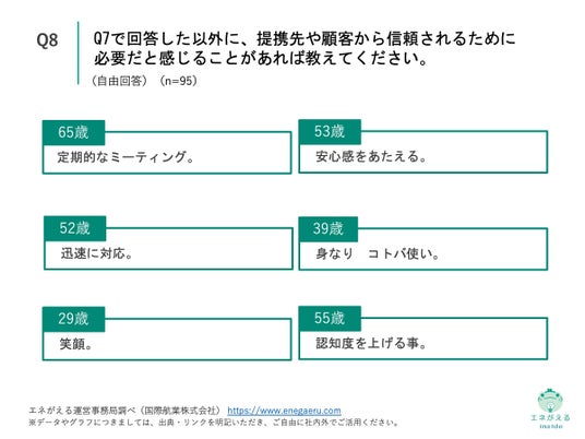 「Q8. Q7で回答した以外に、提携先や顧客から信頼されるために必要だと感じることがあれば教えてください。」(n=95)と質問したところ、