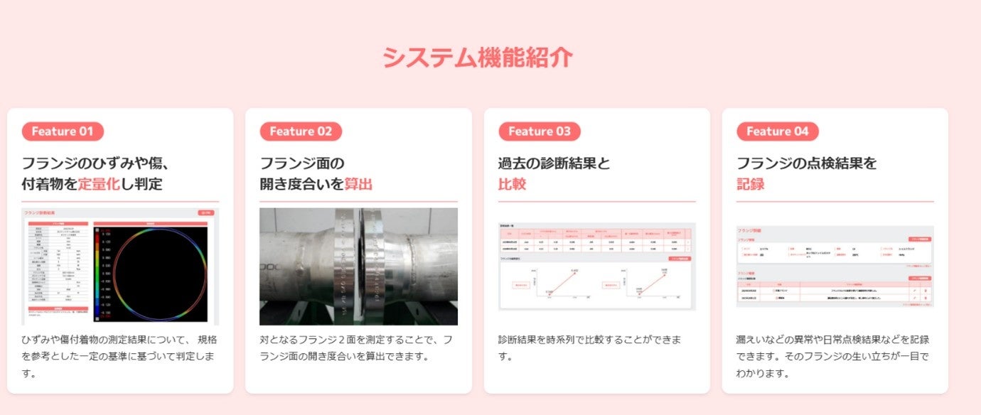 従来のプラント保全では、フランジ面の状態確認に特化したデジタルサービスはほとんどなく、主に現場担当者の経験に依存していました。「フランジカルテ(R)」は定量的なデータ取得と当社独自の解析ソフトを組み合わせた国内初のソリューションです。