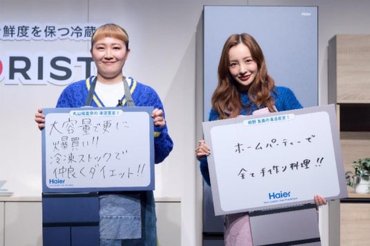 板野さんは、冷凍の活用方法がもっとあるということを本日は知り、ホームパーティーをする前にたくさん作り置きできるのも良いと大容量について絶賛。さらに、従来の冷凍庫では「食材がパサパサになりがち」「すぐ忘れて霜だらけにしちゃう」といった丸山さんの悩みも、ハイアールではそれが防げるのがすごく魅力的です、と新商品の機能に期待を寄せていました。