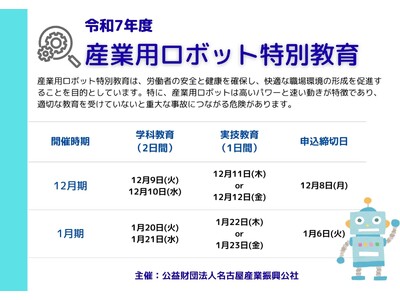 産業用ロボットを操作・保守する作業者に対して、特別教育を受けることが求められます。学科2日+実技1日=合計3日間の講習です。