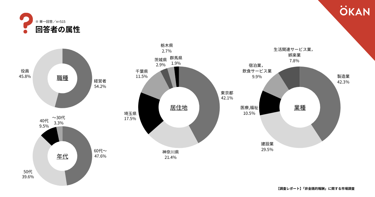 「望まない離職」を生まない組織づくりを支援する株式会社OKAN(本社:東京都豊島区、代表取締役:沢木恵太、以下OKAN)は、ノンデスクワーカーやエッセンシャルワーカーが働く企業※の経営に携わる関東地方在住の経営者・役員515名を対象に、「非金銭的報酬」に関する市場調査を行いました。