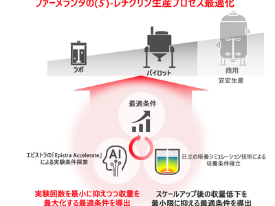 本実証は、エピストラの実験条件最適化と日立の培養シミュレーション技術を組み合わせ、医薬原料成分の生産プロセスをラボからパイロットスケール(*4)まで一貫して最適化し、スケールアップ時の収率低下を抑制することを目的としています。