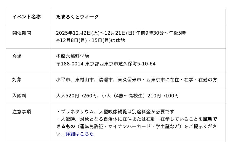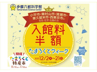 このたび5市の魅力を紹介する「たまろくとウィーク」を開催し、この期間中は5市の市民のみなさま(注1)を入館料半額でお迎えします。