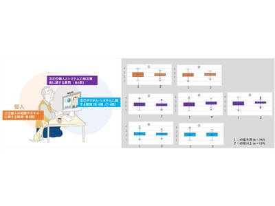 eHLQは健康に関する概念や用語の理解、デジタルサービスを積極的に活用する能力や意欲などに関する35問からなる質問票で、デジタル先進国であるデンマークで2018年に開発されました。eHLQは世界20ヶ国語以上の言語に翻訳されており、世界保健機構(WHO)が実施する、「非感染性疾患の予防と管理のための健康リテラシー育成」プロジェクト*4にも採用されています。今回、研究チームはデンマークのeHLQ開発チームの支援のもと、日本語版eHLQを作成し、計量心理学的解析*5で信頼性と妥当性を確認しました。さらに 、eHLQのスコアを年齢、健康状態、デジタルヘルス利用状況などの要因別に比較した結果、以下の知見が得られました。