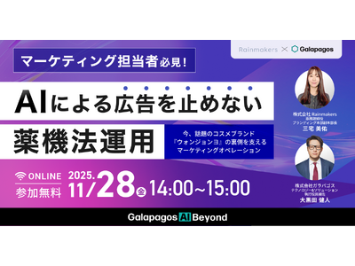 株式会社ガラパゴスは2025年11月28日(金)、「AIによる広告を止めない薬機法運用」と題したウェビナーを開催します(主催:株式会社ガラパゴス)。