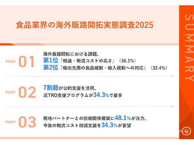~実務を熟知したパートナー選びが海外展開成功の鍵~ デジタル貿易プラットフォームの開発・提供を手がける株式会社STANDAGE(東京都港区、代表取締役社長:足立彰紀、以下スタンデージ)は、日本国内で食品を海外に輸出している企業、または過去に輸出経験がある企業において、海外輸出・海外販路開拓業務に携わっている方108名を対象に、食品業界の海外販路開拓実態調査2025を実施しましたので、お知らせいたします。- 01|海外販路開拓における課題、第1位「輸送・物流コストの高さ」(36.1%)、第2位「輸出先国の食品規制・輸入規制への対応」(32.4%)- 02|7割超が公的支援を活用、JETRO支援プログラムが34.3%で最多- 03|現地パートナーとの信頼関係構築に48.1%が注力、今後の物流コスト削減支援を34.3%が要望本調査のダウンロードはこちら■調査概要- 調査名称:食品業界の海外販路開拓実態調査2025- 調査方法:IDEATECHが提供するリサーチマーケティング「リサピー(R)?」の企画によるインターネット調査- 調査期間:2025年10月16日~同年10月17日- 有効回答:日本国内で食品を海外に輸出している企業、または過去に輸出経験がある企業において、海外輸出・海外販路開拓業務に携わっている方108名※合計を100%とするため、一部の数値について端数の処理を行っております。そのため、実際の計算値とは若干の差異が生じる場合がございます。≪利用条件≫1 情報の出典元として「おまかせ貿易」の名前を明記してください。2 ウェブサイトで使用する場合は、出典元として、下記リンクを設置してください。URL:https://boueki.standage.co.jp/digitrad/■現在または過去において輸出していた先、「東南アジア」が50.9%で最多 「Q1.あなたのお勤め先が現在輸出している、または過去に輸出していた国・地域を教えてください。(複数回答)」(n=108)と質問したところ、「東南アジア(シンガポール、タイ、ベトナム、マレーシア、インドネシア等)」が50.9%、「中国(香港・マカオを含む)」が47.2%、「台湾」が38.9%という回答となりました。- 東南アジア(シンガポール、タイ、ベトナム、マレーシア、インドネシア等):50.9%- 中国(香港・マカオを含む):47.2%- 台湾:38.9%- 北米(アメリカ、カナダ):38.9%- 韓国:34.3%- 欧州(EU加盟国、イギリス等):21.3%- オセアニア(オーストラリア、ニュージーランド):14.8%- 南米(ブラジル、チリ等):8.3%- 中東(UAE、サウジアラビア等):7.4%- その他:1.9%- わからない/答えられない:2.8%■約半数が、海外販路開拓のために「商社・貿易会社を経由した輸出」を活用 「Q2.あなたのお勤め先が海外販路開拓のために活用している、または活用していた方法を教えてください。(複数回答)」(n=108)と質問したところ、「商社・貿易会社を経由した輸出」が47.2%、「海外の展示会・商談会への出展」が41.7%、「国内の展示会・商談会での海外バイヤーとの商談」が40.7%という回答となりました。- 商社・貿易会社を経由した輸出:47.2%- 海外の展示会・商談会への出展:41.7%- 国内の展示会・商談会での海外バイヤーとの商談:40.7%- 現地代理店・ディストリビューターとの契約:29.6%- 越境EC(Amazon Global、Shopify等)への出品:20.4%- 現地法人・支社を通じた販売:18.5%- 海外の小売店・スーパーへの直接営業:10.2%- 自社ECサイトでの海外向け販売:9.3%- 海外の飲食店・レストランへの直接営業:6.5%- その他:0.9%- - 親会社- 特にない:4.6%- わからない/答えられない:0.9%■輸出している、または輸出していた食品カテゴリー、第1位「加工食品(レトルト、冷凍食品、インスタント食品等)」、第2位「飲料(清涼飲料、茶、コーヒー等 ※酒類を除く)」 「Q3.あなたのお勤め先が海外に輸出している、または輸出していた食品カテゴリーを教えてください。(複数回答)」(n=108)と質問したところ、「加工食品(レトルト、冷凍食品、インスタント食品等)」が33.3%、「飲料(清涼飲料、茶、コーヒー等 ※酒類を除く)」が30.6%、「酒類(日本酒、焼酎、ビール、ウイスキー等)」が26.9%という回答となりました。- 加工食品(レトルト、冷凍食品、インスタント食品等):33.3%- 飲料(清涼飲料、茶、コーヒー等 ※酒類を除く):30.6%- 酒類(日本酒、焼酎、ビール、ウイスキー等):26.9%- 調味料(醤油、味噌、だし、ソース等):25.9%- 菓子類(スナック、チョコレート、和菓子等):24.1%- 農産物・水産物(生鮮・加工):16.7%- 健康食品・サプリメント:11.1%- 米・穀物類:4.6%- 乳製品(チーズ、バター等):4.6%- その他:3.7%- - 食品添加物- - 海苔- - 電機機器- - 工具■海外販路開拓のために活用した支援、「JETRO(日本貿易振興機構)の支援プログラム」、「商工会議所・商工会の支援」が上位 「Q4.あなたのお勤め先が海外販路開拓のために活用している、または活用していた支援施策を教えてください。(複数回答)」(n=108)と質問したところ、「JETRO(日本貿易振興機構)の支援プログラム」が34.3%、「商工会議所・商工会の支援」が28.7%という回答となりました。- JETRO(日本貿易振興機構)の支援プログラム:34.3%- 商工会議所・商工会の支援:28.7%- 自治体(都道府県・市区町村)の補