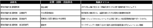 従業員や職員、住民に対して、生活習慣病予防の啓発、健康増進のための優れた取組をしている企業・団体・自治体から計103件の応募を受け、有識者からなる評価委員会による書類選考及び表彰式当日のプレゼンテーションを実施し、厚生労働大臣最優秀賞1件、厚生労働大臣優秀賞3件、スポーツ庁長官優秀賞3件、厚生労働省健康・生活衛生局長優良賞13件を決定しました。
