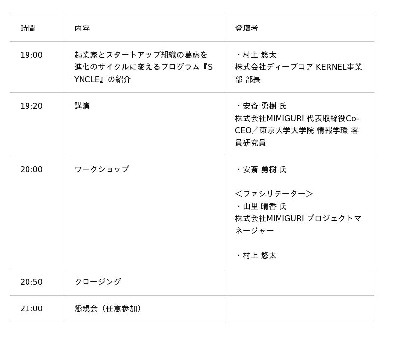 本イベントでは、プログラムの特別講師でもあるMIMIGURI Co-CEO 安斎 勇樹氏を招き、スタートアップが直面する「人と組織の壁」を乗り越え、冒険的な経営を実現するための知見をワークショップ形式で探究します。