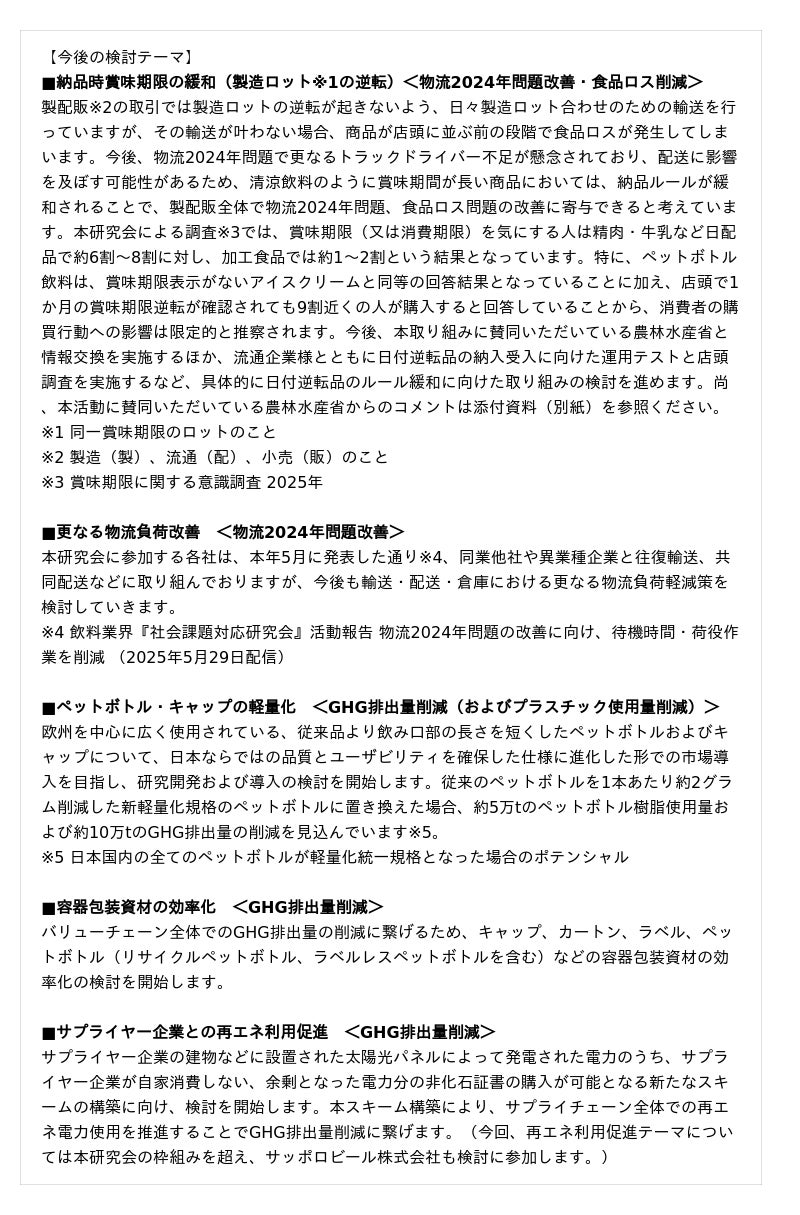 特に、環境負荷低減や持続可能な社会の実現に向けた社会的責任が高まる中、飲料業界として、従来の枠組みを超えた業界横断的な協働を通じて、容器包装などの資材や物流分野における課題解決と、食品ロス削減など環境負荷低減の両立を目指しています。今後、以下の通り、広く社会課題に対応していくための議論・研究を進めていきます。