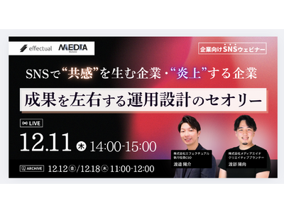 株式会社エフェクチュアル(本社:東京都港区、代表取締役:田中倫明)は、株式会社メディアエイドと共催で広報・マーケティング・ブランド担当者向けオンラインセミナー「SNSで“共感”を生む企業、“炎上”する企業 ─ 成果を左右する運用設計のセオリー」を2025年12月11日(木)11:00より開催いたします(参加費無料)。