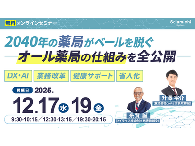 クラウド電子薬歴『CARADA 電子薬歴 Solamichi』の企画・開発・販売を行う株式会社ソラミチシステムは、12月6日(土)に開催するリアルセミナー「2040年の薬局がベールを脱ぐ~オール薬局の仕組みを全公開~」が既に多数の申し込みをいただいていることを受け、同セミナーの録画を12月17日(水)、19日(金)に無料配信します。