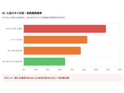 その結果、「42℃以上の熱いお湯派」は「ぬるめ派」に比べて肌乾燥の実感率が約2倍であること、入浴後30分以内に保湿している人はわずか23.7%にとどまること、30分以上の長風呂派の約7割が肌トラブルを経験していることなど、普段の入浴習慣が肌コンディションに大きく影響している実態が明らかになりました。