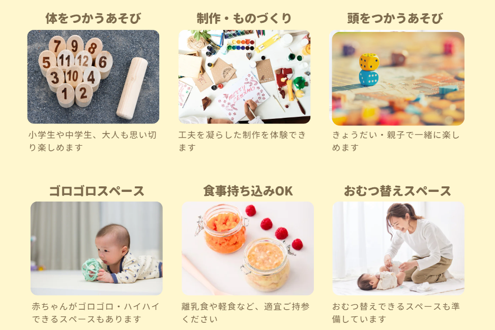「あそび」を媒介とした交流: 学生のアイデアによる楽しい遊びを通じて、乳幼児とその保護者が地域の人々とつながる「多世代交流」のきっかけを提供します。