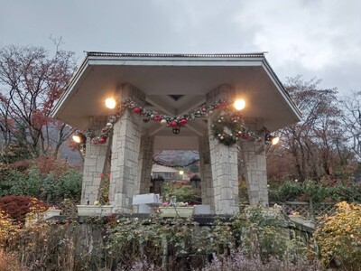 箱根強羅公園の音楽堂に、12月1日(月)~12月25日(木)まで「クリスマスフォトスポット」が登場します。初めての試みとなるこのフォトスポットは、園内にあるモミの木や野バラを使った園内スタッフによる手作りのクリスマスリースや、赤やゴールドのオーナメントを使用した約10mのガーランドなどで装飾されています。