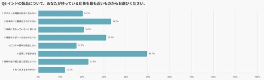 インド製品に対する印象では、「品質に不安がある」が49.7%と最も高く、他項目を大きく引き離す結果となりました。