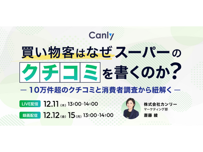 Google ビジネスプロフィール、Yahoo!プレイス、Appleマップなどの3大地図媒体、HP、アプリ、SNSなどの店舗集客媒体の一元管理サービス「カンリー店舗集客」の開発・提供を行う株式会社カンリー(所在地:東京都品川区、代表取締役:辰巳 衛,秋山 祐太朗)は2025年12月11日(木)・12日(金)・15日(月)13時よりスーパー業界向けセミナー【買い物客はなぜスーパーの"クチコミ"を書くのか…?~10万件超のクチコミと消費者調査から紐解く顧客心理と、サービス向上のヒント~】をオンライン開催いたします。