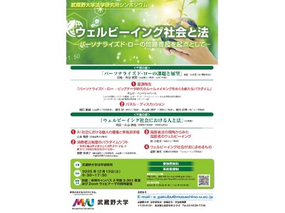 武蔵野大学法学研究所(所長:片山 直也)は、12月13日(土)に武蔵野大学有明キャンパス3号館でシンポジウム『ウェルビーイング社会と法―パーソナライズド・ローの問題提起を起点として―』を開催します。