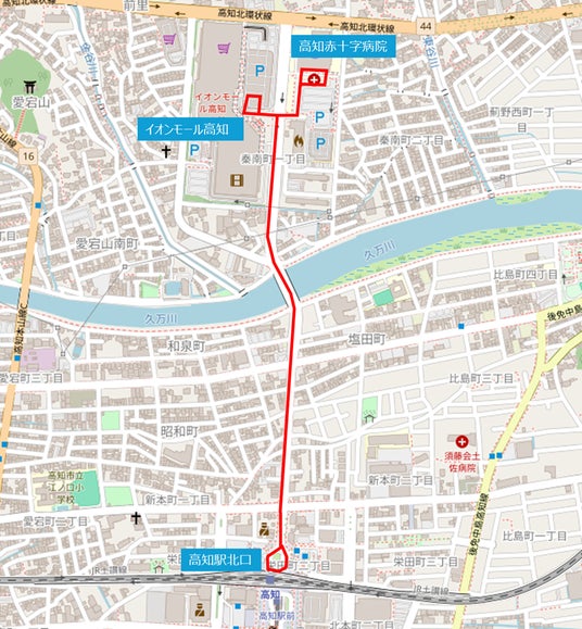 JR高知駅→イオンモール高知→高知赤十字病院→JR高知駅【片道:約1.1km】