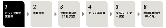 本プログラムでは、NTT西日本グループのアセットと応募企業のイノベーティブなデータやソリューションを組み合わせた事業共創をめざします。エントリーいただいた企業から、書類選考を実施し、通過した企業(5社予定)によるピッチを実施します。その中から、NTT西日本の事業との共創親和性が高い事業アイデアを採択し、共創検討を実施します。共創にあたっての実証実験予算等は、必要に応じてNTT西日本にて負担します。また、採択企業の要望に応じて、NTTグループCVC※2の株式会社NTTドコモ・ベンチャーズ(以下、NDV)が出資を検討します。※3
