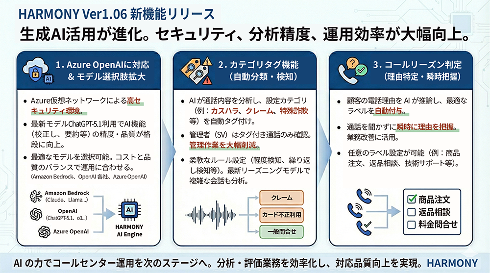 今回のVer1.06では、Azure OpenAI 対応により、高セキュリティ環境での生成AI利用を実現するとともに、会話理解・自動分類の精度を大きく向上する「カテゴリタグ機能」および「コールリーズン判定」を新たに搭載しました。これにより、オペレーターの入力作業削減、SVの管理業務効率化、顧客対応品質の向上といった多面的な業務改善が可能となります。