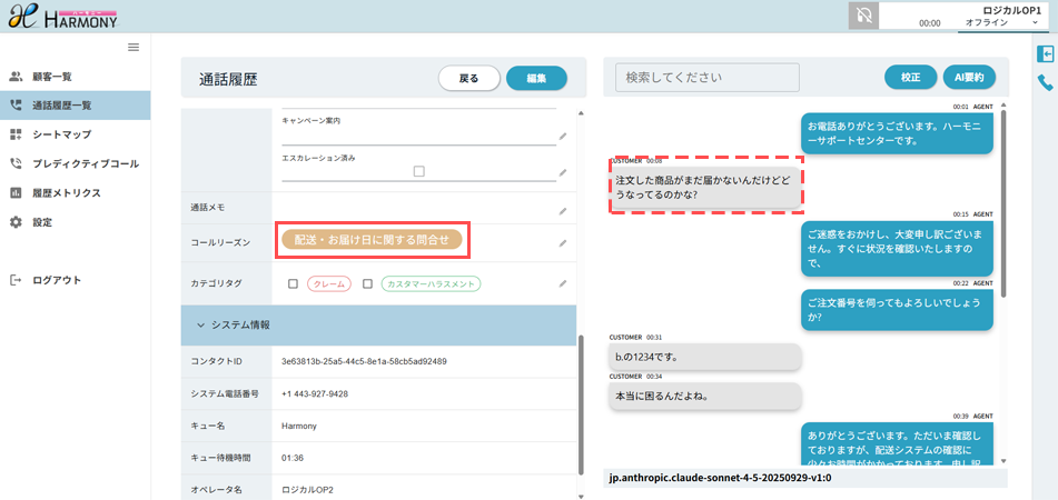 上図のように、コールリーズン機能(この例の場合は配送・お届け日に関する問合せ)を利用しますと、下図のように、通話内容を分析した結果から、設定したコールリーズン(電話の理由)に一致するものを抽出することができます(赤線でマークした箇所)。