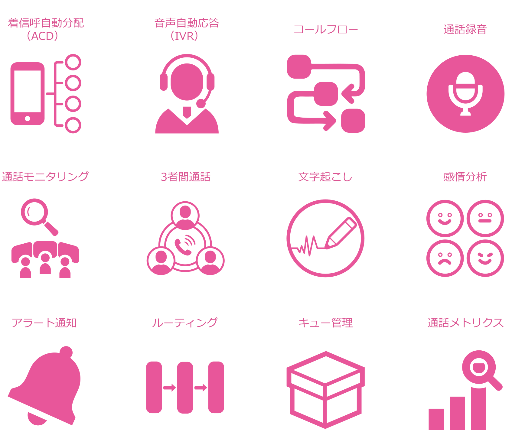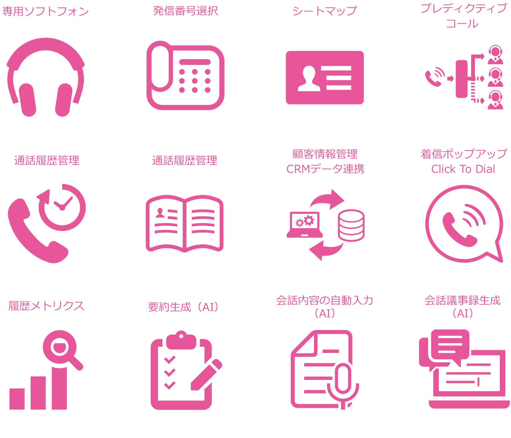 生成AIを活用した通話要約や文字起こし、文字起こし校正、会話議事録生成、顧客管理機能、プレディクティブコール機能、シートマップ機能、パフォーマンス分析機能など、コールセンター運営に必要な機能を豊富に備えています。