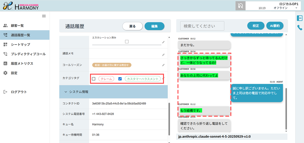 上図のように、カテゴリタグ機能(この例の場合はカスタマーハラスメント)を利用しますと、下図のように、通話内容を分析した結果から、設定したカテゴリに一致するものを抽出することができます(緑でハイライトした箇所)。