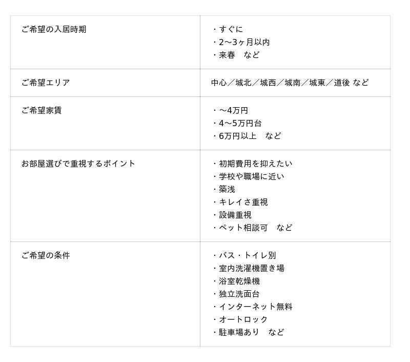 入居時期・希望エリア・家賃上限・重視ポイントなどを回答すると、スタッフが内容を確認し、