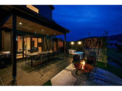 ジャグジーは夜になるとやさしい光で照らされ、水面にほのかな反射が広がります。白いジャグジーと黒のタイルが落ち着いたコントラストを生み、スタイリッシュでリラックスできる空間に。併設の焚き火を眺めながら過ごせば、穏やかに心身をほぐす夜のひとときをお楽しみいただけます。
