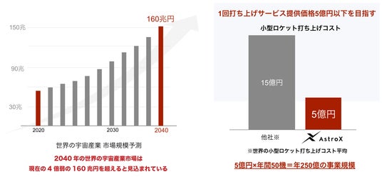 宇宙産業は世界的に急成長しており、世界の宇宙産業市場は2040年には約160兆円を超えると予測されています。その中でも衛星を使ったサービスなど人工衛星の需要が大きく伸びており、それに伴い小型衛星の打ち上げ需要は急増しています。しかし現在、日本国内では衛星を宇宙に運ぶロケットが不足しており、国内の小型衛星のほとんど100%を海外ロケットで打ち上げています。この打ち上げ機会の不足が日本の宇宙開発の大きな課題となっています。
