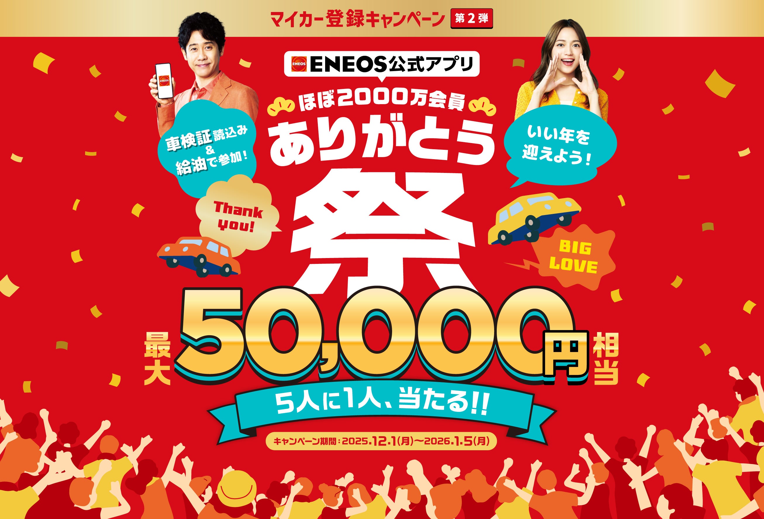 ENEOS株式会社(以下、「ENEOS」)は、「ENEOS公式アプリ ほぼ2000万会員 ありがとう祭」を2025年12月1日(月)~2026年1月5日(月)の期間で実施いたします。期間中、アプリでマイカー登録を行い、1回20L以上の給油をすると、抽選で最大50,000円相当*²の「えらべるPay」が当たります。