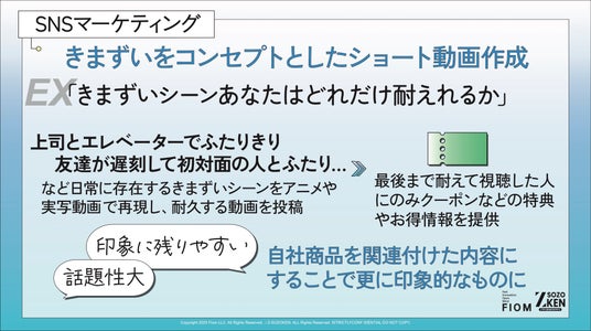 具体的なアイデアとして、「気まずいシーンあなたはどれだけ耐えられるか」というショート動画企画を提案しています。 「上司とエレベーターで二人きり」などの日常的な気まずいシーンを再現し、最後まで視聴した人にクーポンを配布するなど、エンタメと販促を掛け合わせた施策です。