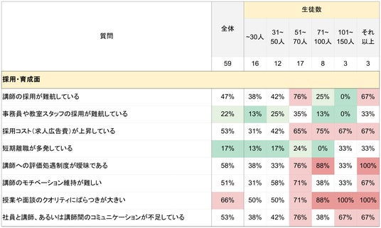 また、「生徒数51~70人」「それ以上(151人以上)」において講師の採用難航をより強く実感している結果となりました。