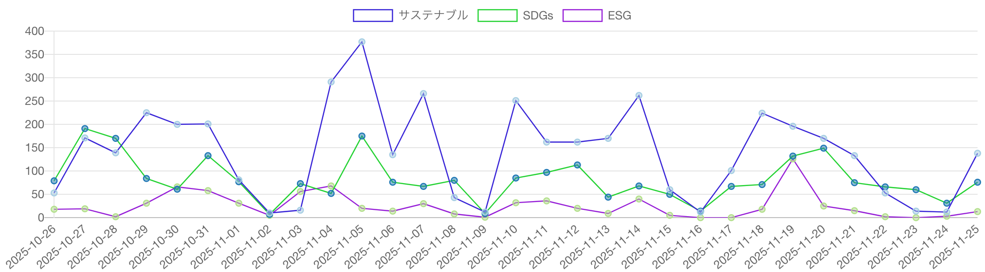 株式会社トドオナダ(代表取締役社長 松本泰行)は、2025年10月26日~11月25日までのSDGs・ESG・サステナビリティに関するウェブニュースについて調査・分析いたしました。4,000以上のWEBメディアをモニタリングできるPR効果測定サービス「