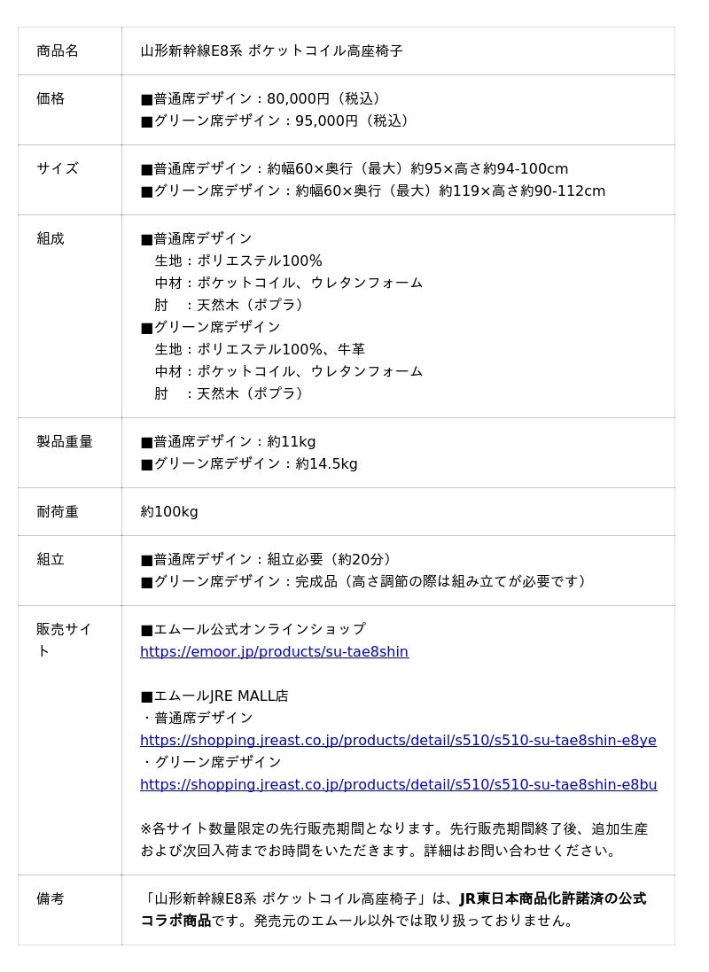 身体に合った「寝る・座る・たたむ」を提供する健康家具ブランドEMOORを展開する株式会社エムール(東京都立川市:代表取締役 高橋 幸司/以下エムール)は、2025年12月1日より、東日本旅客鉄道株式会社(東京都渋谷区:代表取締役社長 喜㔟陽一)の山形新幹線 E8系とコラボした【ポケットコイル 高座椅子】の