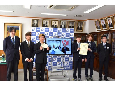 渡邊研究室はこれまでに2年連続、計3作品で優秀賞を受賞していましたが、最優秀賞の受賞はなく、今回ついに悲願の最優秀賞獲得となりました。11月13日(木)にはJBAのオフィスと一関高専をオンラインで接続し授賞式が執り行われ、当日は小林淳哉校長より、賞状と副賞が学生たちに伝達されました。