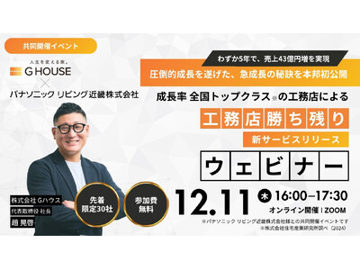 株式会社Gハウス(所在地:大阪府大阪市旭区、代表取締役社長:趙 晃啓)は、2025年12月11日(木)にパナソニック リビング近畿株式会社との共催による特別ウェビナーを開催いたします。本ウェビナーでは、現代表の就任からわずか5年で売上43億円増を実現し、全国トップクラスの成長率*を達成したその背景と新たに展開するサービスを業界関係者の皆さまに向けて限定公開いたします。