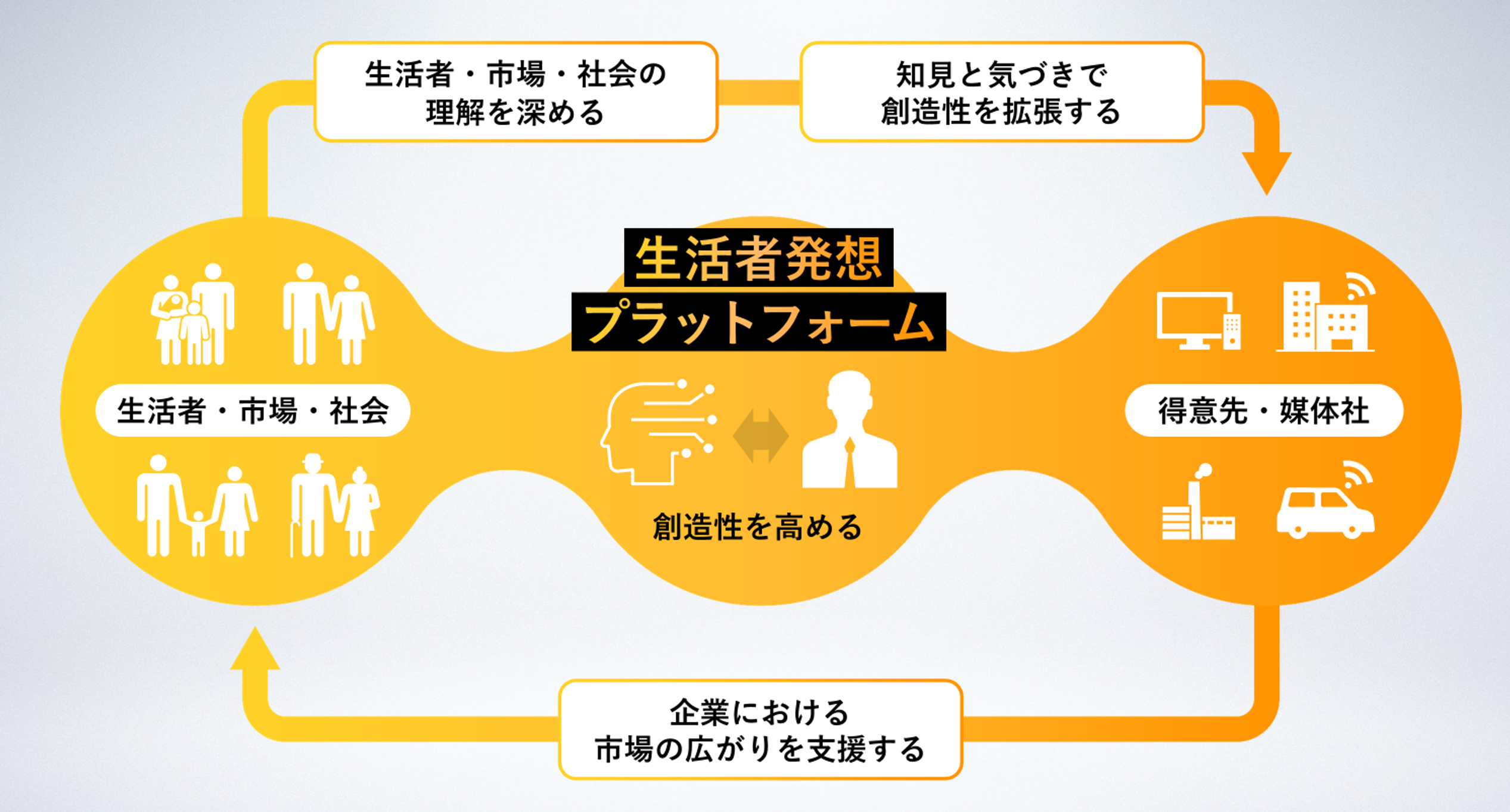 生活者・市場への深い理解や、新しい発見・価値創造をAIとともに行い、AI×生活者発想でビジネスの拡大を支援する、そのコアとなるのが「生活者発想プラットフォーム」です。AIという、自分とは違う存在を味方につけ、生活者の心を動かすアイデアを生み出し、創造性の拡張へつながる、新しい発想の基盤となります。