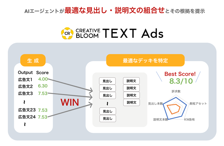 CREATIVE BLOOM TEXT Ads は、検索連動型広告(リスティング広告)の効率的かつ効果的なPDCAを実現するプロダクトです。広告文生成AIにより各キーワードにマッチした多様な広告文を生成することができるほか、効果予測AIで事前に広告文の評価を行うことができます。あらかじめ高い効果を見込める広告文だけを出稿することで、より質の高い広告運用に寄与します。