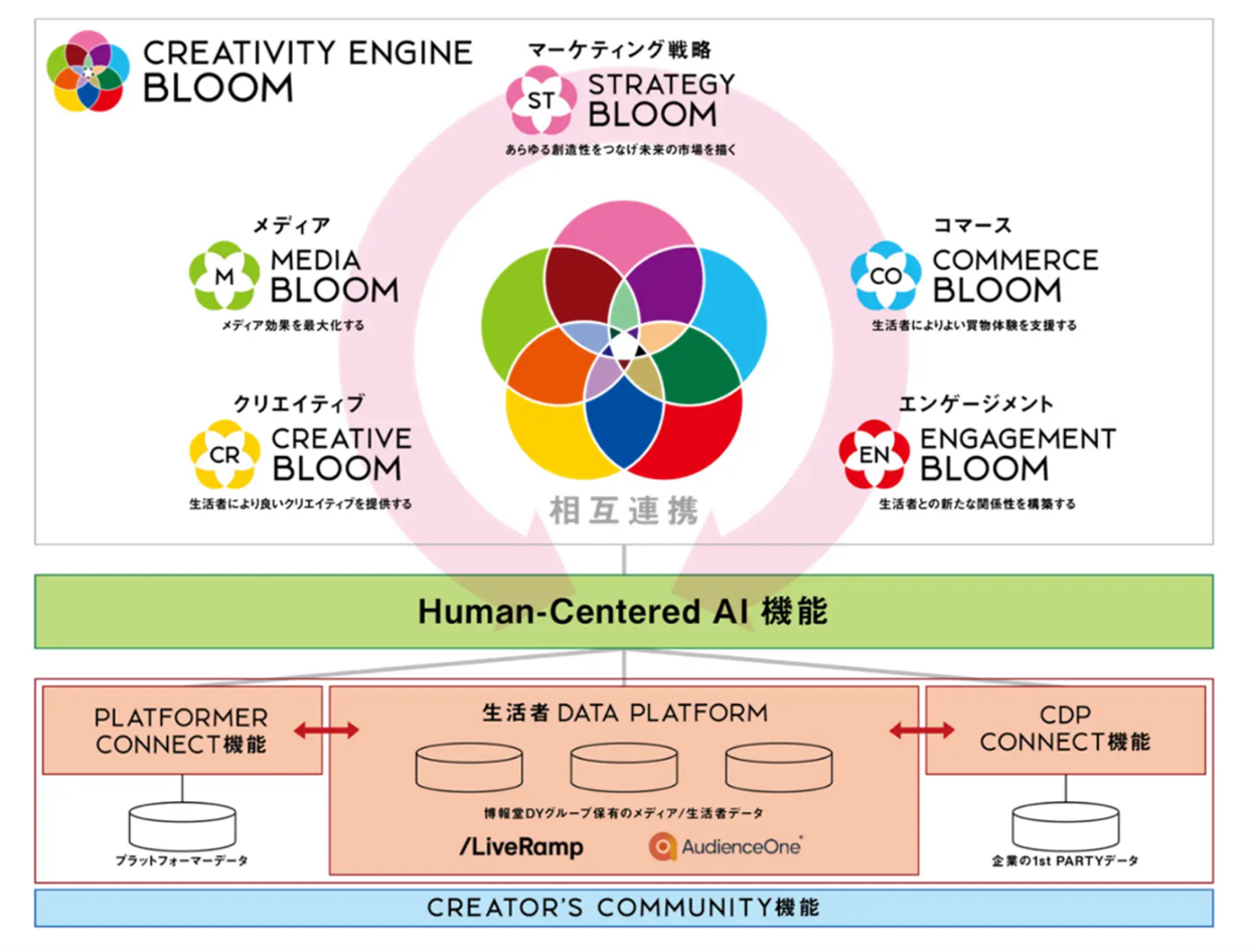 生活者発想プラットフォームにて生まれた生活者発想を、 CREATIVITY ENGINE BLOOMの各プロダクトをはじめとした様々なマーケティングAIソリューションで精度を高めて実行し、AI 時代の企業マーケティングを支援してまいります。