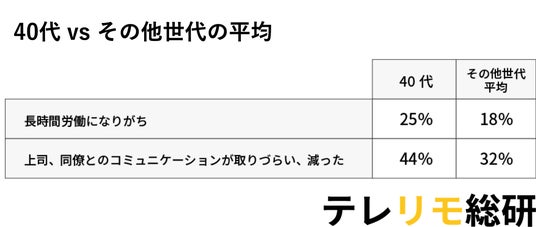 さらに大きな差を生んだのが「上司、同僚とのコミュニケーションが取りづらい、減った」という項目。40代では44%と高い数値を示していますが、その他の世代平均では32%と、実に12ポイントもの開きがあります。