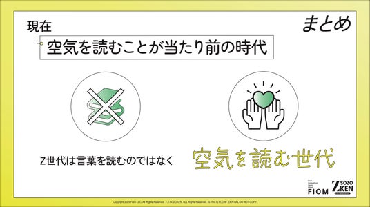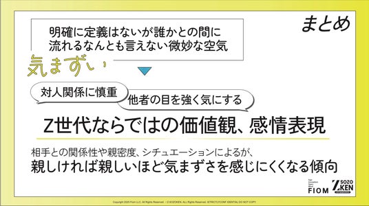 Z世代に特化したクリエイティブカンパニーFiom合同会社(本社:東京都渋谷区、代表社員:竹下洋平)が運営しているZ世代の実態や価値観を分析するシンクタンク、Z-SOZOKEN(Z世代創造性研究所)は、Z-SOZOKEN THINKTANK 最新調査研究レポートの第二弾として『Z世代の気まずいの感覚』についての調査研究レポートの第11章インサイトサマリー「まとめ:Z世代の対人関係と空気感」をリリースしました。