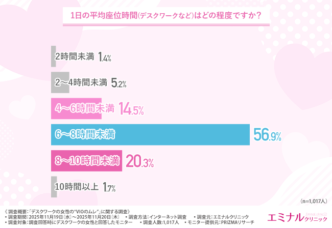 はじめに、「1日の平均座位時間(デスクワークなど)はどの程度ですか?」と質問したところ、以下のような回答結果になりました。