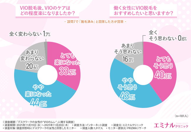 実際にVIO脱毛を経験した人の多くが、ムレや不快感の軽減、ケアのしやすさの向上を実感しており、これが「働く女性にもおすすめしたい」と感じる理由につながっていると考えられます。VIO脱毛は美容目的にとどまらず、「仕事中の快適さ」や「衛生面の向上」といった実用的なメリットをもたらすケアとして受け入れられつつあるといえるでしょう。